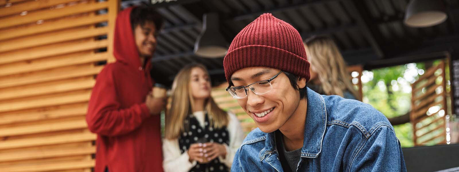Chico sonriéndole al celular Chico sonriendo mientras usa el celular